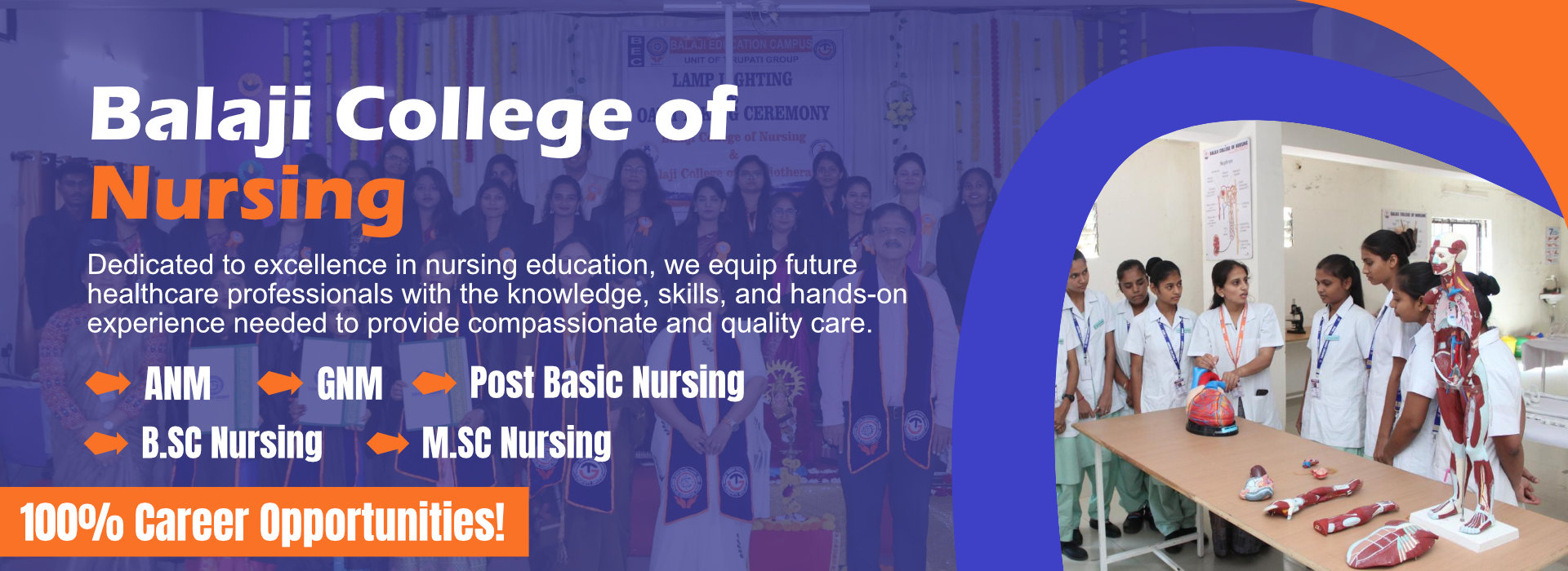 Balaji College of Nursing is a premier institution under the Tirupati Group of Business (TGB), dedicated to nurturing skilled healthcare professionals. Established with a mission to provide high-quality nursing education, the school offers a comprehensive curriculum that combines theoretical knowledge with practical clinical experience.